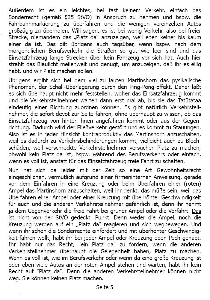 Ich schreibe die ganze Zeit von der Benutzung des Martinshorns. Ja, natürlich in Verbindung mit dem Anschalten des Blaulichts. Auch führe ich hier Argumente aus, die ihr in der Regel vorbringt, um das Anschalten des Martinshorns zu rechtfertigen. Nun, ich laße hier mal die Thematik außen vor, daß ihr nicht hoheitlich agiert, weil wir keinen Staat haben, der hoheitliche Befugnisse weitergeben kann, denn wir leben in einem Besatzungskonstrukt mit einer Besatzungsverwaltung. Es gilt daher die Haager Landkriegsordnung, weil wir uns immer noch im Kriegszustand befinden. In der Haager Landkriegsordnung ist es ausdrücklich verboten, die besetzte Bevölkerung zu schikanieren, zu terrorisieren und oder zu drangsalieren. Das sind Kriegsverbrechen. Das nur kurz dazu.